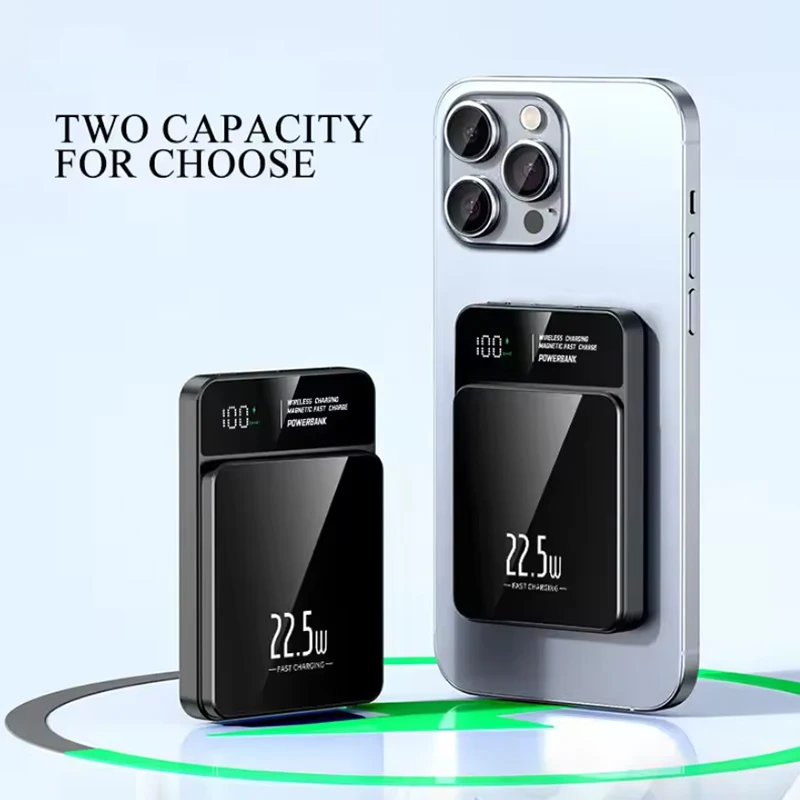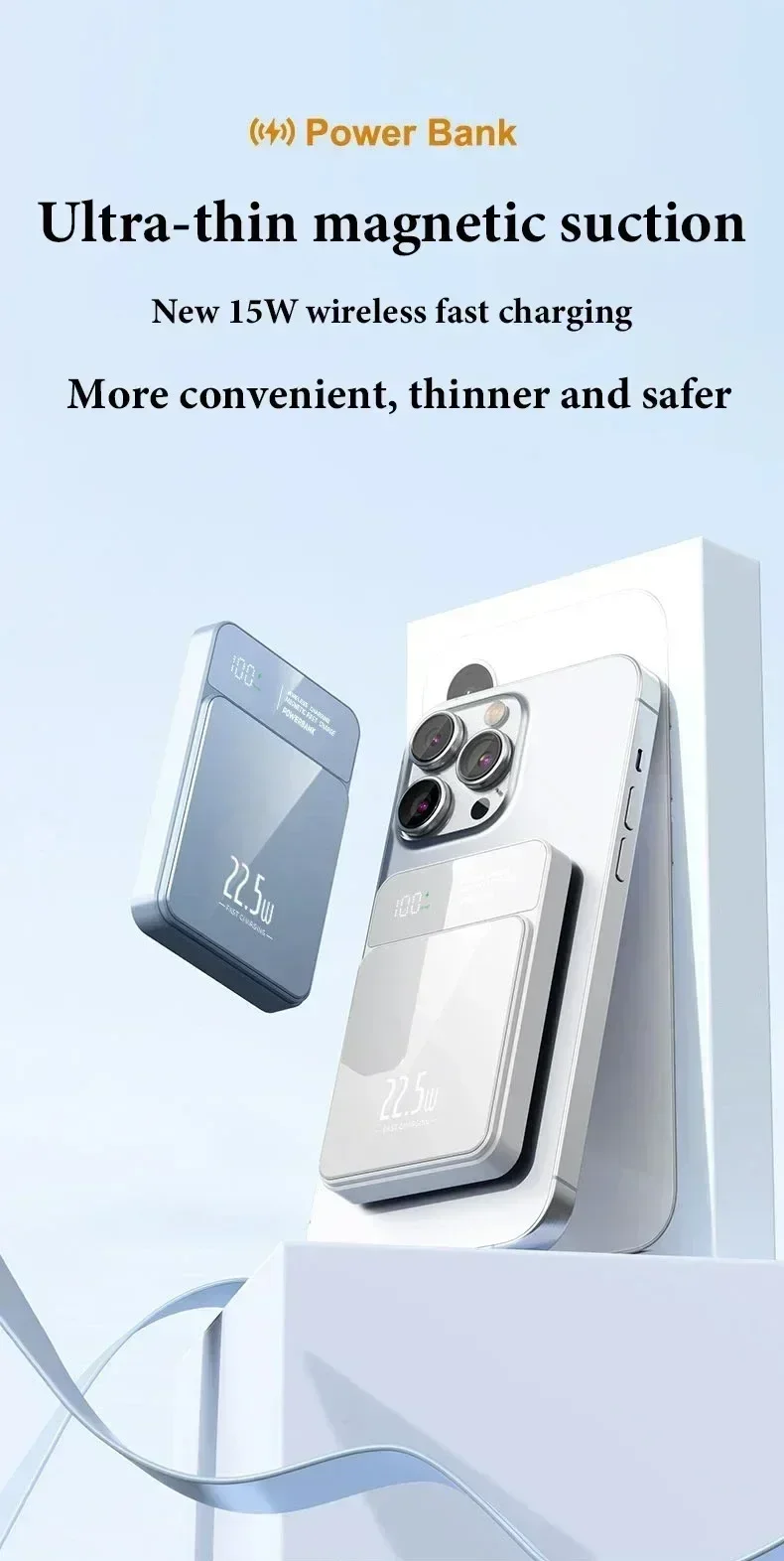 Power Bank magnético 10000mAh ultra fino com carregamento rápido 22.5W. Wireless + USB, leve e portátil. Ideal para iPhone e Android.